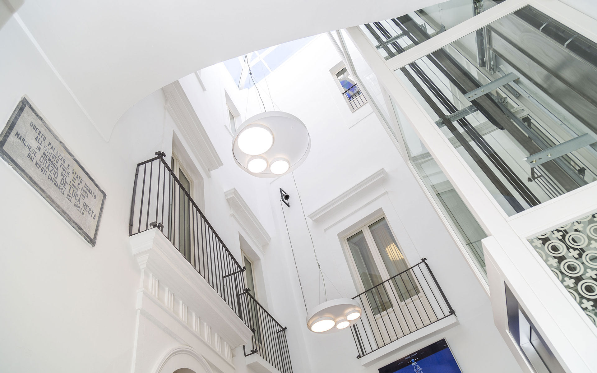 La realizzazione nell’atrio di ingresso di una copertura in alluminio e cristallo e la sostituzione dell’ascensore esistente con uno nuovo in vetro e acciaio sono state scelte determinanti al fine di restituire luminosità e importanza alle facciate dell’atrio interno. Sono stati valutati con attenzione lo stato di conservazione e l’interesse di ogni singolo materiale, recuperando quelli reimpiegabili, sia per gli spazi interni che per quelli esterni. La rifunzionalizzazione degli impianti elettrico, idrico-fognante e termico è stata adoperata nell’ottica dell’efficientamento energetico.